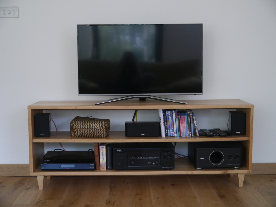 Stylish solid oak TV stand, designed to fit flush against the wall